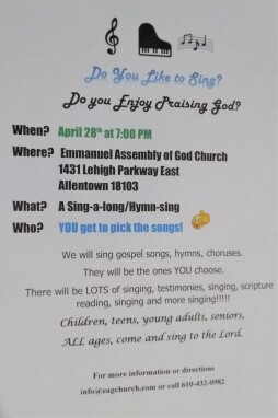 We will sing gospel songs, hymns, choruses.