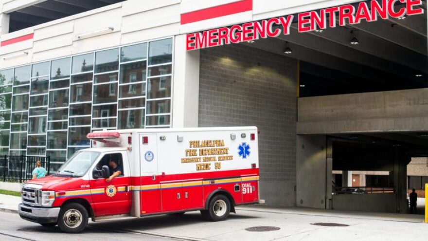 An ambulance pulls out of the emergency entrance at Temple University Hospital.